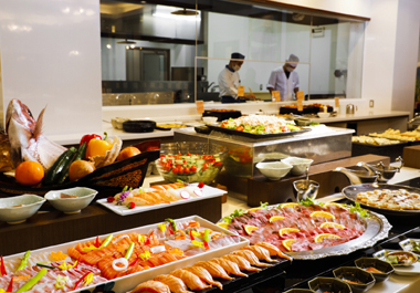 オープンキッチンスタイルで焼きたてのステーキ、お寿司や天婦羅などバラエティに富んだお料理をご堪能下さい。