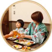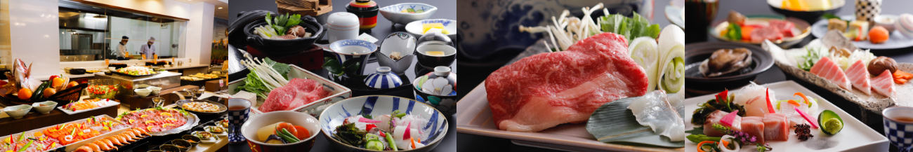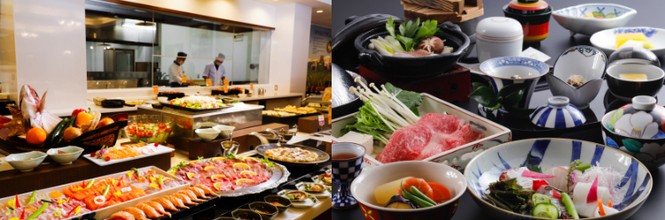 夕食は当館自慢の会席料理、もしくは種類が豊富なビュッフェをお楽しみ頂くことができます。