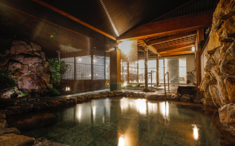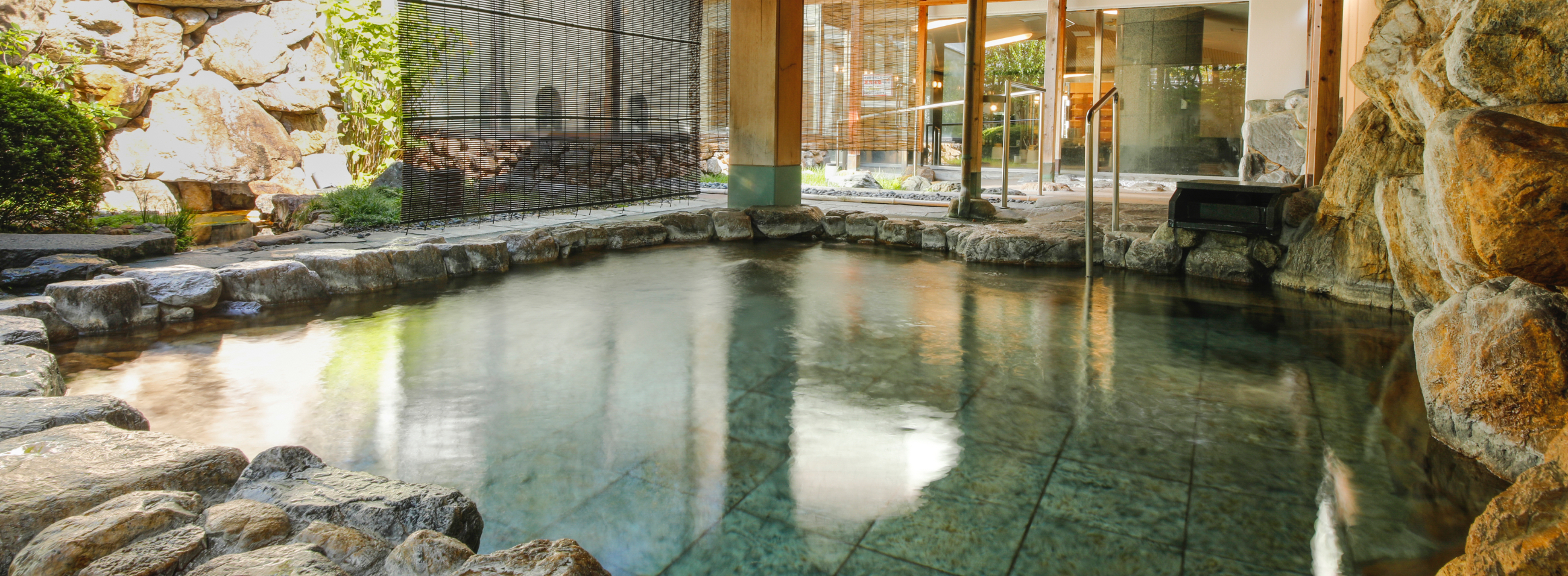 アルカリ性単純泉のお湯は、透明で湯ざわりも柔らかく、身体によく馴染みます。そのお湯をひく大浴場は、1日の疲れをゆったりと癒せるよう御影石(みかげいし)で作られており、落ち着いた雰囲気をかもし出しています。