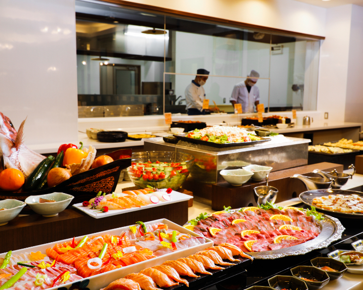 当館はゆっくりとした時間を過ごしながら味わえる会席料理はもちろんのこと小さなお子様連れのご家族やご友人と楽しく過ごせるビュッフェ形式のお料理も自慢です。